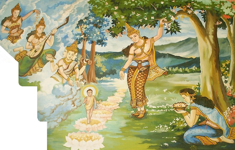 Thái tử Siddhartha Gautama (Tất Đạt Đa) ra đời năm 623 trước JC trong một gia đình hoàng gia Sakya de Kapilavastu (Thích Ca thành Ca Tỳ La Vệ con vua Tịnh Phạn) một vương quốc ở phía Nam Népal, cách Lumbini 21km. Phong tục đương thời Hoàng hậu phải trở về quê cha mẹ để sinh nở, trên đường về đến Lâm Tỳ Ni, bà vịn cành cây và sinh ra Thái tử Tất Đạt Đa. Hoàng hậu Maya Devi mất sau khi sanh ngài ra được bảy ngày, thái tử được bà dì nuôi dưỡng.
